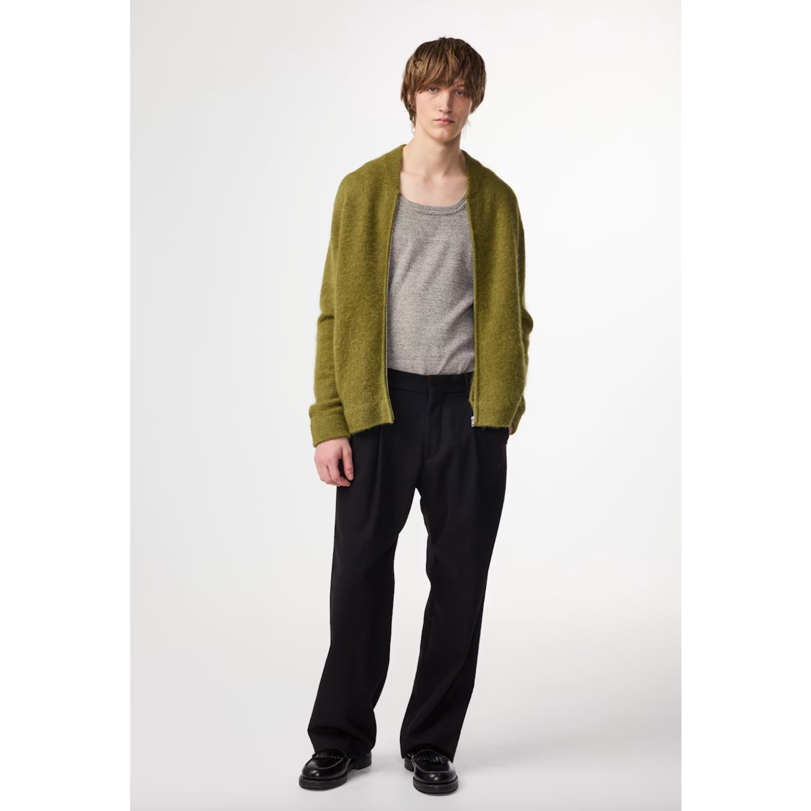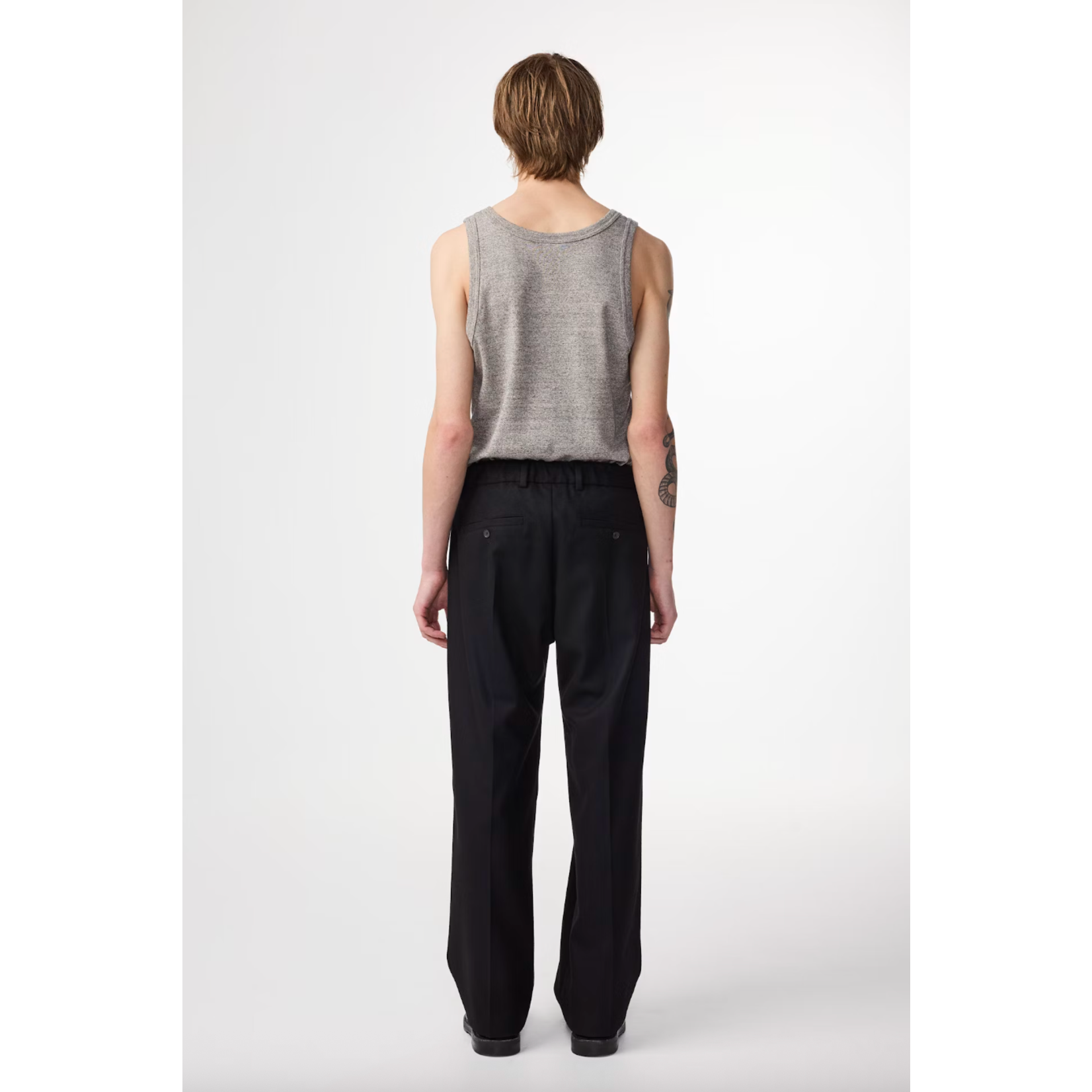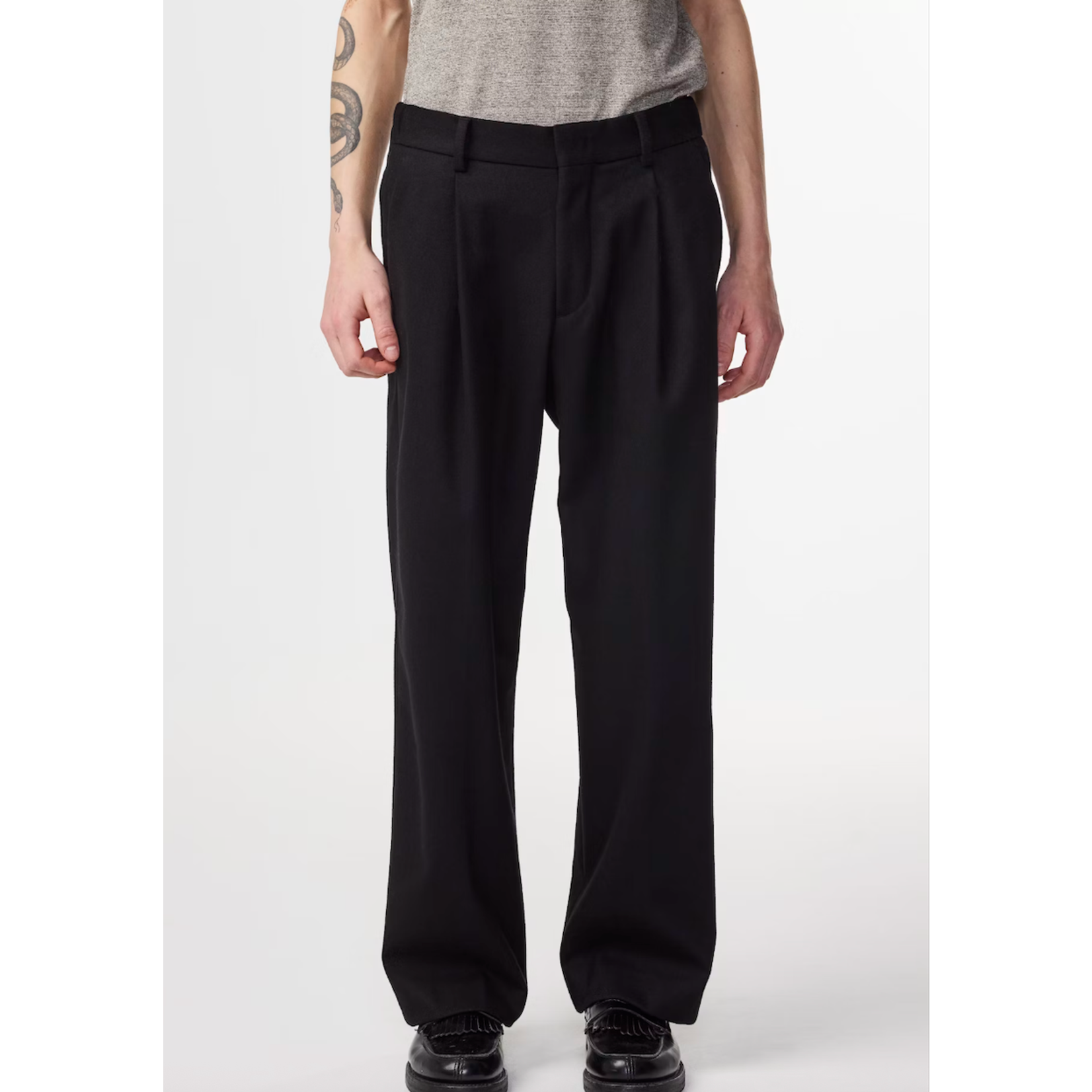 Made from a 380 g/m² recycled wool blend, these dress trousers offer a premium handfeel while having a relaxed fit. The pleats at front and wool twill weaving give the trousers a classic and clean look, featuring pockets on the back and a hook and bar plus zipper for closure.